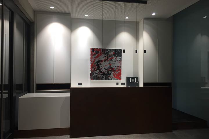 Leistung: Erstellung der Raumaufteilung, in Absprache mit dem Architekturbüro Haas & Haas , Auswahl + Anordnung der Leuchten (Vibia, Exenia, Sattler, Oty), Farbgestaltung (Farrow&Ball), Bodenbeläge (Bolon,Forbo), Gardienen (Baumann Creation), Möbel (Embru, Interstuhl).